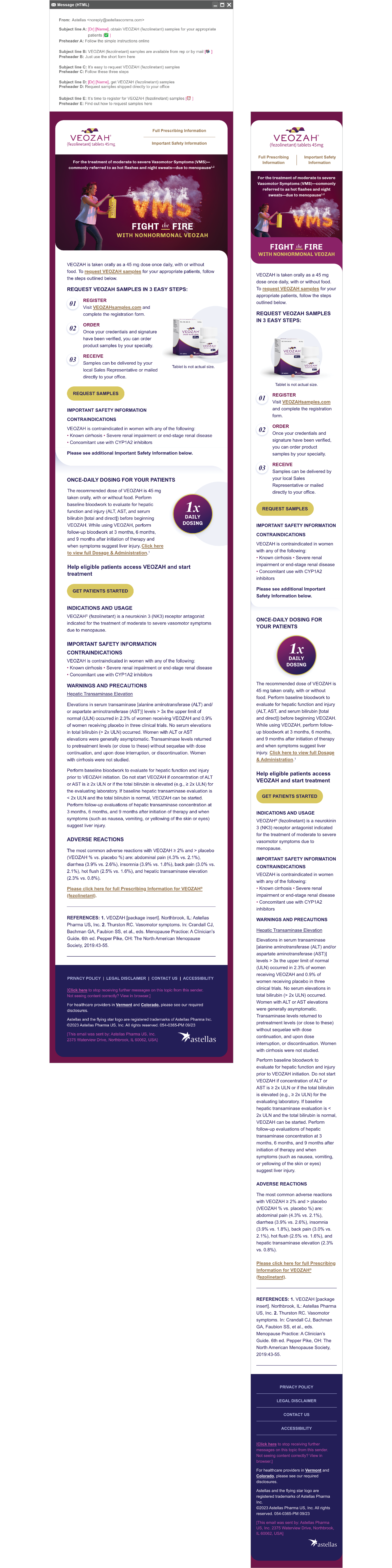 This is a non-personal promotional email I design for VEOZAH. It’s targeted for HCPs specifically to encourage them to order samples for their practice. I created this layout for desktop and mobile.